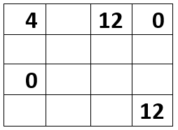 ضع الأعداد 0 و4 و8 و12 ضمن المربعات الفارغة المبينة في الشكل بحيث يكون مجموع كل سطر ومجموع كل عمود ومجموع كل من القطرين 24. يمكنك استخدام كل رقم أكثر من مرة واحدة.